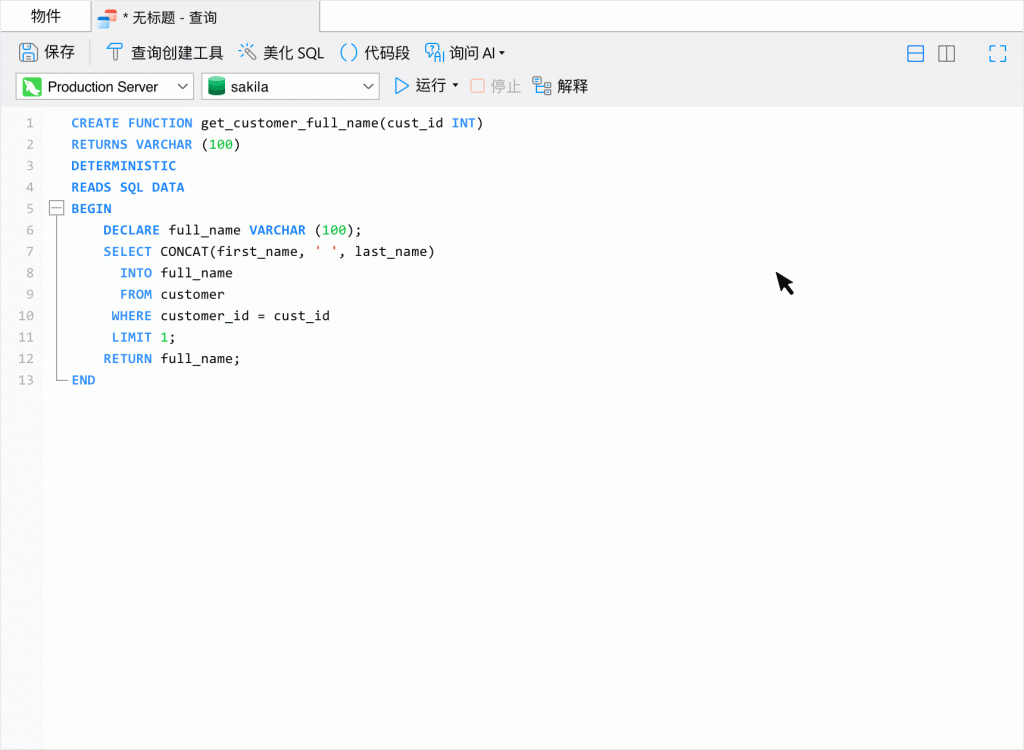 了解我们的 “询问AI” 功能 – 它旨在简化你的查询开发工作流程。你可以自定义和固定你喜欢的 AI处理,因此只需单击一下即可完成常见的任务。此外,“询问AI”还附带了内置处理,用于解释、优化、格式化和转换不同数据库的 SQL 查询,使你的查询在任何地方都能正常工作。你会喜欢通过并排视图来轻松比较更改,并且在你确认之前不会应用任何内容,因此一切尽在你的掌握中。