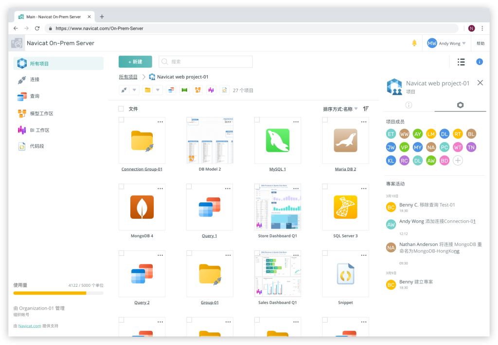 Navicat On-Prem Server 是一个本地解决方案,适用于需要管理其 Navicat 文件并促进内部团队协作的组织。它创建了一个集中的私有环境,分散式团队可以在其中共享数据、协调任务并实时高效沟通。
